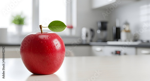 apel merah segar dengan daun hijau di atas meja dapur modern dengan ruang untuk teks (copy space).