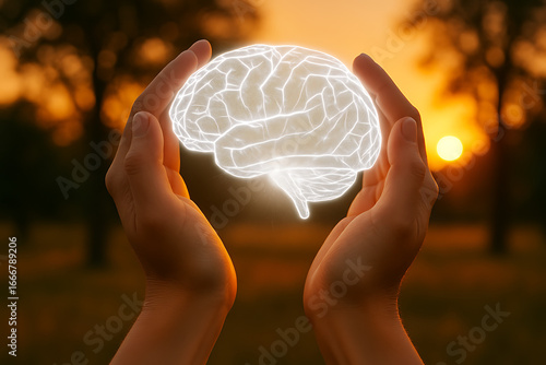 Two human hands hold a glowing, intricate brain outline against a sunset backdrop, representing creative thought and the boundless potential of the human mind