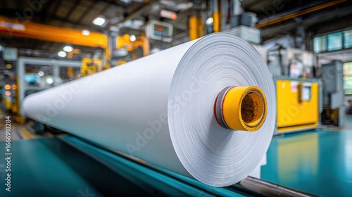 Close-up shot of a large paper roll in a manufacturing factory setting, ready for processing.