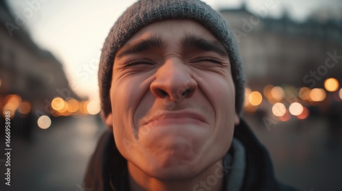 Close-up of a young man grimacing with eyes shut in the city.