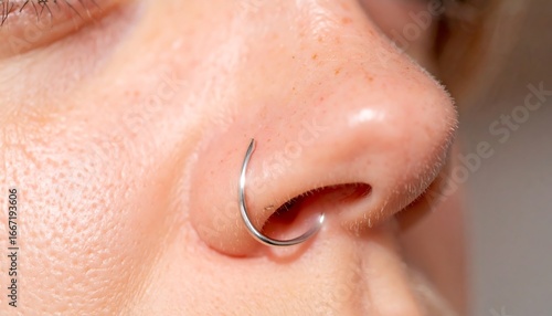 Close-up of a stylish silver septum ring adorning a person's nose, showcasing modern body jewelry fashion