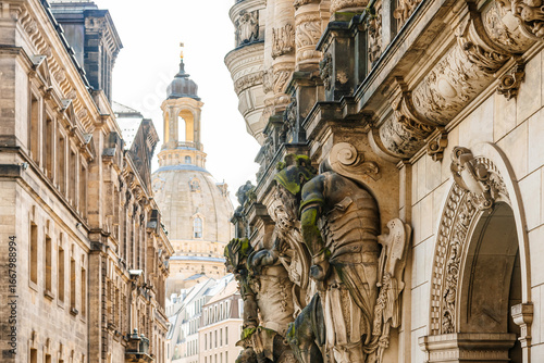 Dresden, View on Auguststraße. Frauenkirche and Sculptures of Ancient Warriors
