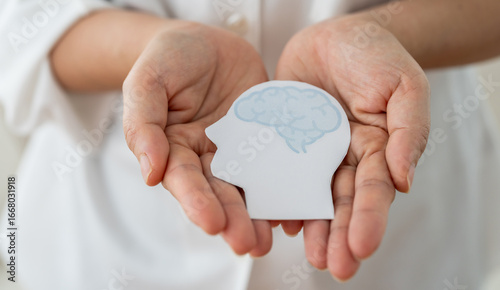 Mental health awareness, human hand care and support hold white paper head and glowing brain with physical and mental health, wellbeing, brain health, psychological support, healthcare and mindfulness