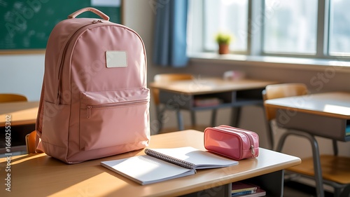 Pink school backpack, notebook, and pencil case on classroom desk, symbolizing back-to-school and learning.