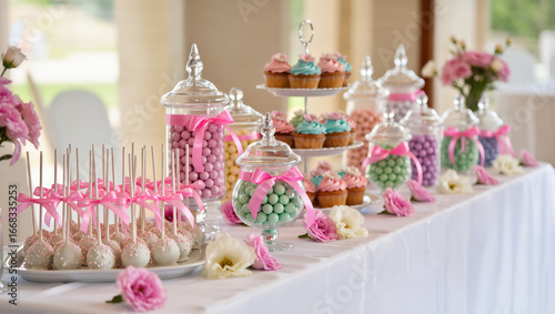 Candy and dessert buffet table with cupcakes, cake pops, and jars of sweets decorated with flowers and ribbons.