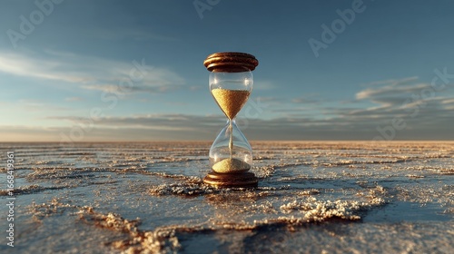 Hourglass with glowing sand standing tall against a clear blue sky, elegant and timeless symbol of passing time, patience, eternity, balance, meditation and philosophical concept