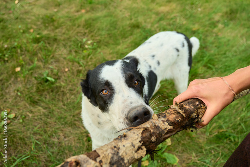 Dog playfully pulls a stick while being held by a person in a green park setting during the day