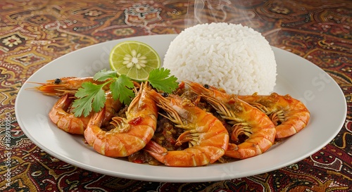 "Potrawa Udang Sambal autentyczne jedzenie Brunei i Malezji krewetki w paście chili sambal"