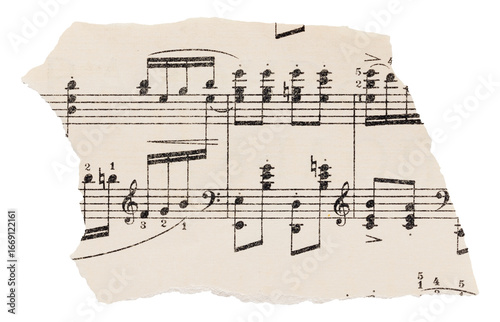 Scrap of old music sheet, vintage yellowed ripped paper with notes isolated for design