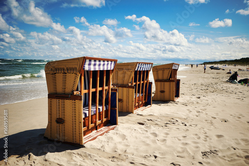 Kosze na plaży. Morze bałtyckie. Chmury. Plaża