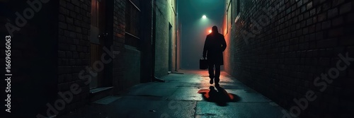 A shadowy figure in a dimly lit alleyway, clutching a briefcase, disappears into the darkness The scene is evocative of clandestine meetings and secret operations , intelligence, thriller, hidden