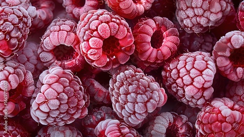 macro shot, top-down view of a full-frame background made of large frozen raspberries covered in frost