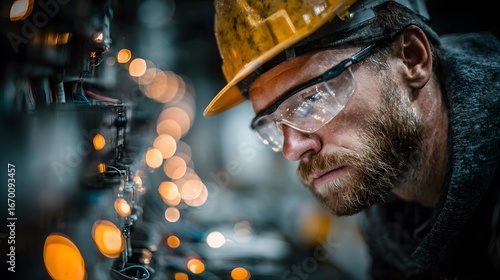 Focused industrial engineer wearing a hard hat and safety goggles, meticulously works on a complex piece of machinery with glowing lights and intricate cinematic wiring.