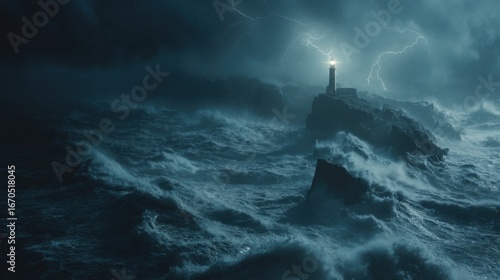A dramatic shot of a lighthouse standing on a rocky cliff during a fierce storm. The image symbolizes hope, safety, and resilience amidst chaos and a dangerous situation.