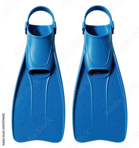 A pair of wet blue swimming flippers for snorkeling or scuba diving with an open heel, Isolated on Transparent and White Background
