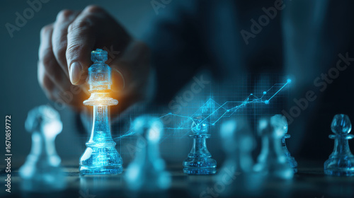 Strategic chess move with hand placing transparent king piece board, symbolizing decision making and planning business or competition. background features digital graph, representing growth