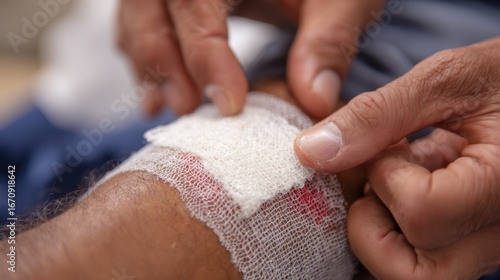 Medium frame of a paramedicine team member applying a protective dressing on a diabetic ulcer emphasizing hands and treatment with soft background.