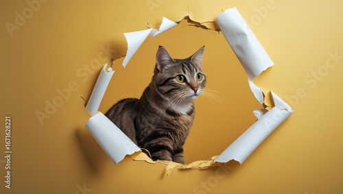 A tabby cat sits attentively in a hole punched through a mustard-yellow wall, revealing its curious gaze.