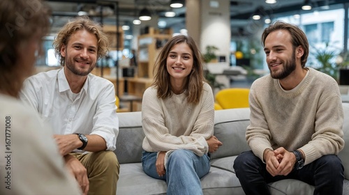 Trois jeunes professionnels souriants assis sur un canapé gris