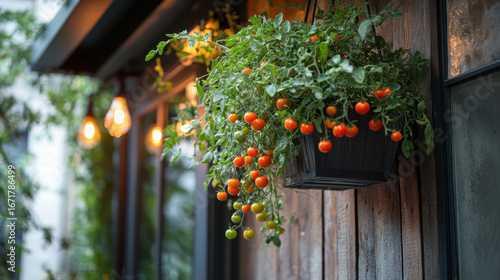 A tomato plant growing in a hanging basket, cascading with small ripe cherry tomatoes over a rustic wooden porch