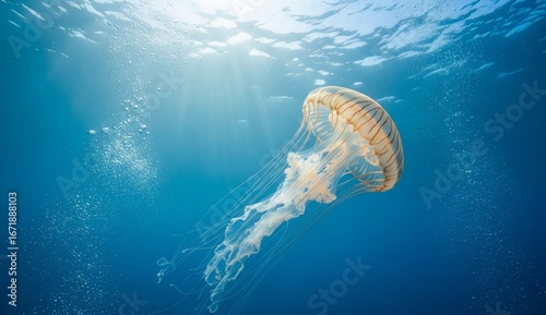 Animals: jellyfish floating in deep blue sea, photographed with glowing translucent body illuminated by natural light.