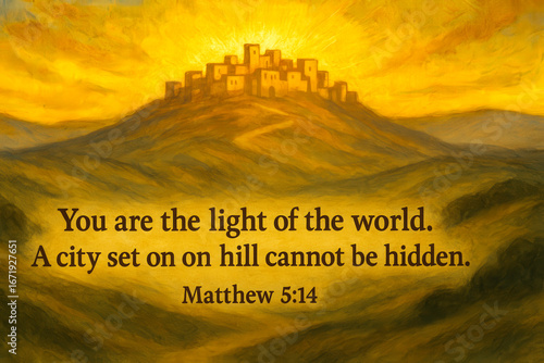 “You are the light of the world. A city set on a hill cannot be hidden” (Matthew 5:14). A radiant city glowing with divine light, symbolizing faith, hope, and Christ’s eternal guidance.