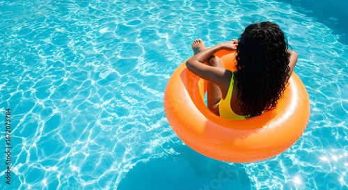 A darkhaired woman in a yellow swimsuit floats in an orange inner tube in a bright blue pool