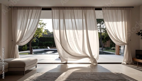 Light-filled living area with flowing sheer curtains, showcasing an outdoor pool and garden.