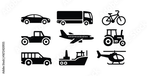 Transportation icon set featuring car, truck, bicycle, airplane, tractor, SUV, cargo ship, and helicopter in black silhouette style
