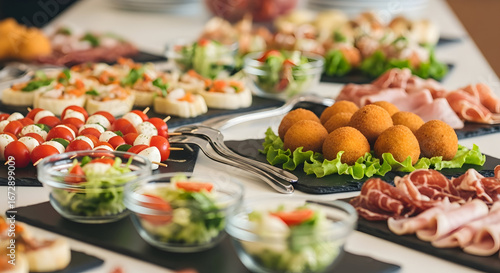 Delicious gourmet appetizers and antipasto buffet perfectly arranged for a corporate event or wedding reception.