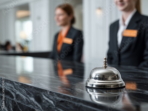 Hotel service bell on a dark marble counter with staff in background, concept for concierge assistance, front desk services and luxurious accomodation