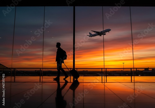 Traveler with Luggage Walking in Airport with Sunset Airplane View