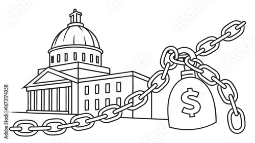 Government Building Chained to Money Bag: Political Financial Control, Debt & Corruption Concept