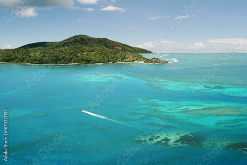 Aerial view. The tropical island is surrounded by a beautiful ocean and coral reefs. A speedboat is leaving the white trail on the waves. Inner islands of Seychelles.