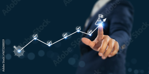 Business success roadmap concept. Points to a upward path marked by progress icons and check marks, representing strategic planning, goal tracking and successful project execution in a corporate.
