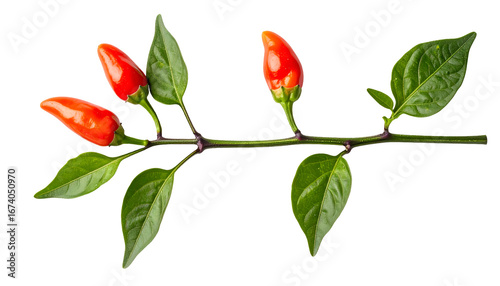 Thai bird’s eye chili branch with three ripe red peppers and glossy green leaves, fresh spicy capsicum sprig on isolated background