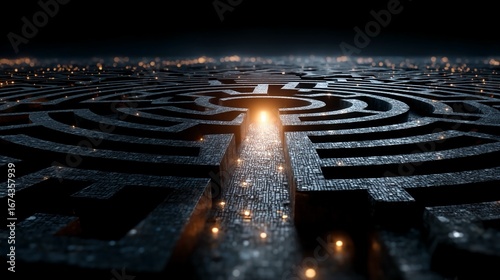 Abstract 3D maze made of data lines and circuit paths with one glowing exit representing system problem solving or debug process in complex tech environments
