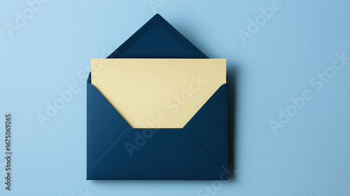 An overhead shot of an open, light blue envelope with a blank yellow note card partially inserted, against a matching blue background.