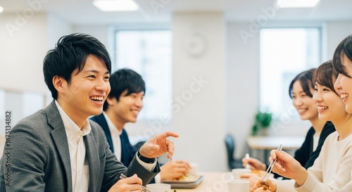 笑顔あふれる交流、同僚と笑顔で食事をする若手社員たち