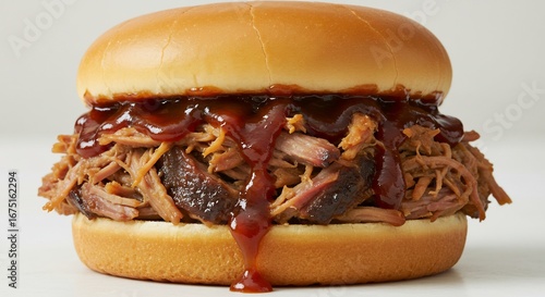 甘辛いBBQソースたっぷりジューシーな豚肉のサンドイッチ 食欲をそそる光沢感. AI Generated