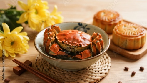 Crab and mooncakes with chrysanthemums