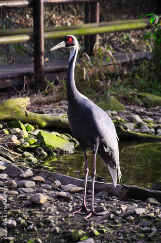 Pełen gracji żuraw stojący nad spokojnym strumieniem, otoczony bujną zielenią i naturalnymi elementami. Uchwyca piękno natury i dzikiej przyrody w spokojnym i cichym otoczeniu.