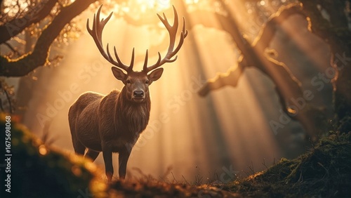 Majestic Red Stag in a Sunlit Forest with Ethereal Light Rays. An ethereal and majestic image of a magnificent red stag standing in a sun-drenched forest. The stag, with its impressive and large antle