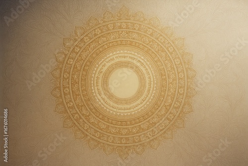 Ornate golden mandala design with Sanskrit details on elegant beige floral background for spiritual and decorative use. Ai generative
