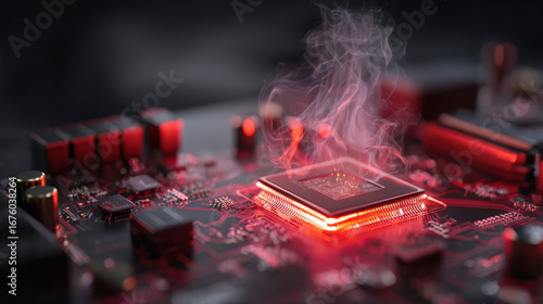 close-up of motherboard with glowing red CPU and small wisps of smoke rising alarm concept high detail macro illustration concept scene visual for commercial design use high detail quality stock