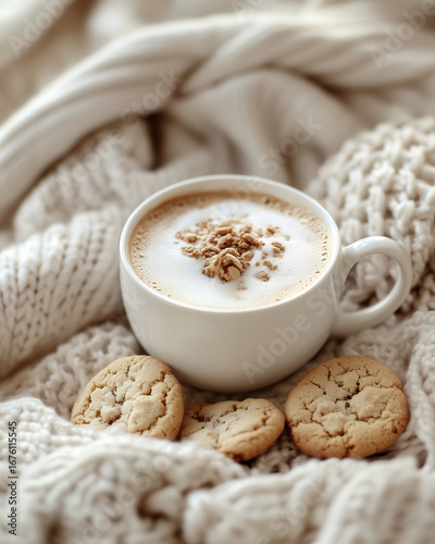 Kubek z kawą posypaną orzechami, ustawiony na beżowym dzianym kocu obok trzech ciasteczek. Całość tworzy przytulną, domową kompozycję.