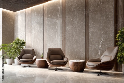 Modern waiting area with light beige marble walls and brown leather armchairs