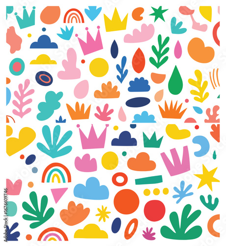 Colorful abstract pattern with rainbows, stars, clouds, crowns, hearts, and playful geometric shapes on white background.