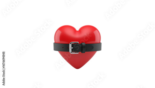 A scarlet heart constrained by a leather belt, a symbol of emotional repression on transparent