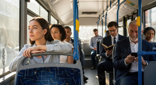 Urban bus interior with diverse passengers traveling on a city bus, including a woman looking through window. City bus transports commuters through urban environment with efficient public transport.